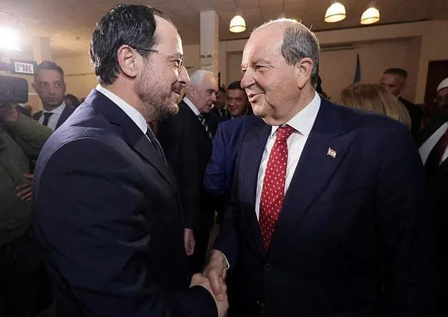 Resepsiyona katılan KKTC Cumhurbaşkanı Tatar ve GKRY lideri Hristodulidis, burada bir araya gelerek ayaküstü sohbet etti.